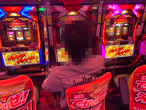 店内をまわっていると、「プレミアムハナハナ‐30」で遊技を満喫しているといったプレイヤーを目撃。充実した時間を過ごしているためか、うれしそうにレバーを叩いていた。