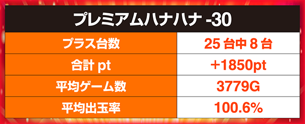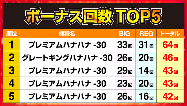 ボーナス回数が60回を超えた「プレミアムハナハナ‐30」の1台がトップを独走!!