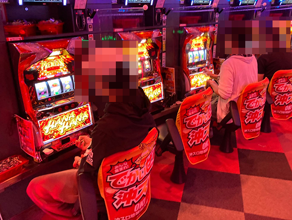 「プレミアムハナハナ‐30」をはじめ、「ツインドラゴンハナハナ‐30」や「グレートキングハナハナ-30」などのハナハナシリーズがひときわ華やかなムード! うれしそうにレバーを叩いている姿からは、遊技を満喫していることが伝わってきた。