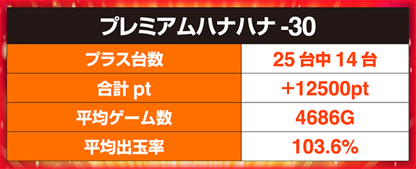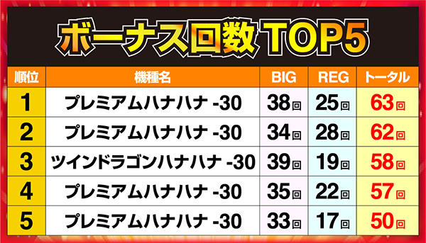 「プレミアムハナハナ‐30」からは4台がランクインし、そのうちの1台がボーナス回数63回でトップ!