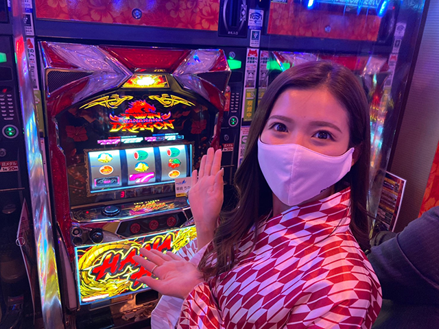 ちかちゃんが選んだのはマルハン小松店でも大人気の「ツインドラゴンハナハナ-30」。すでにたくさんのお客様が楽しんでいるようですね~☆