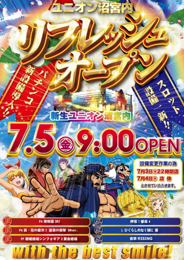 本日☆ユニオン沼宮内☆【リフレッシュオープン】最新機種登場!