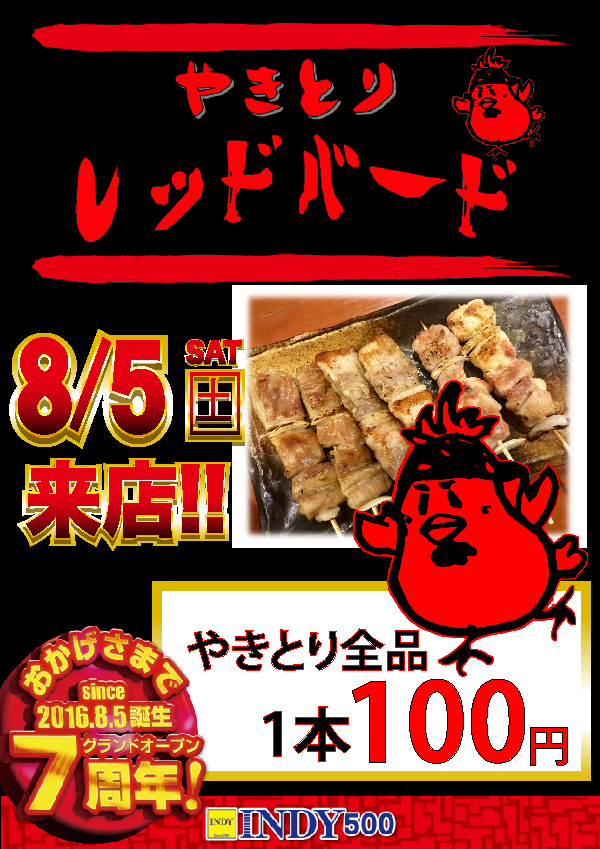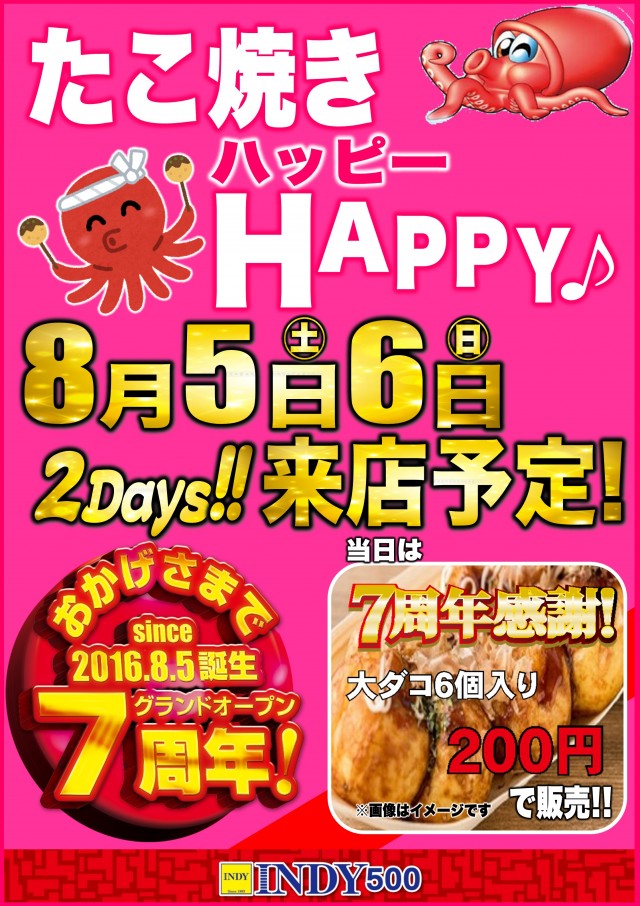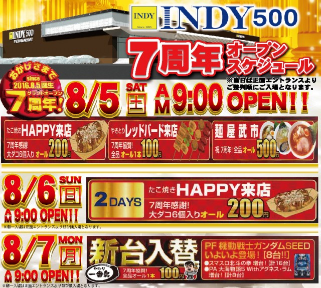 本日8月5日🎊INDY500★7周年🎊あさ9時オープン🎆