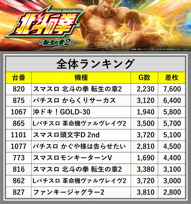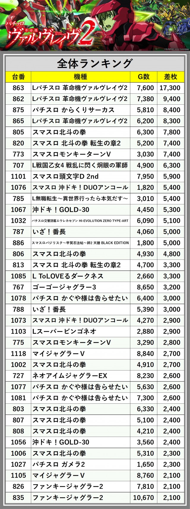 厳選された取材対象機種をはじめ、その他スロット全体から好記録が飛び出した!プレイヤーが楽しんだ1日を下記データにて振り返ってみて欲しい。