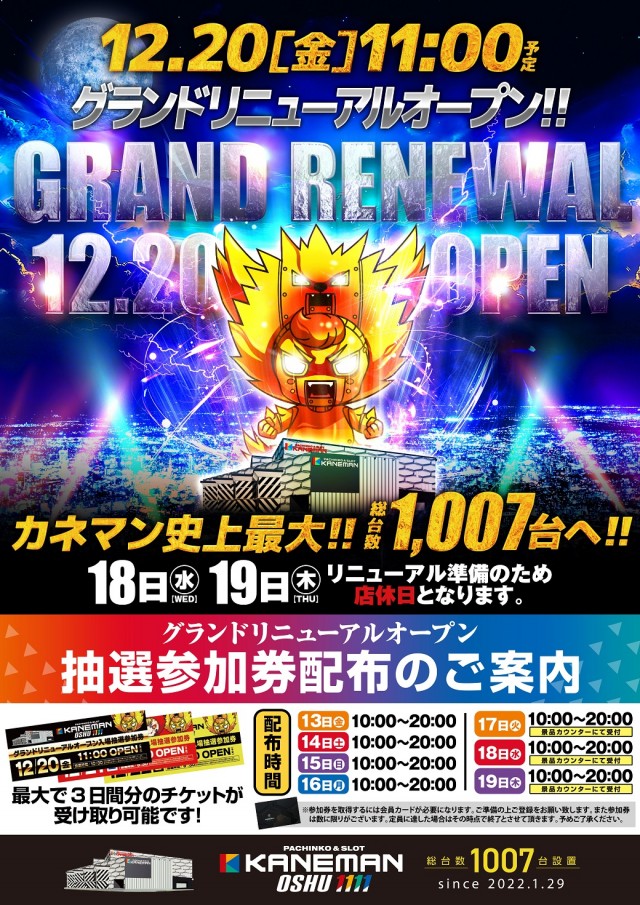 本日グランドリニューアル全台➀➀時フルオープン!!