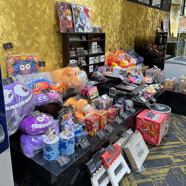 景品コーナーにはたくさんのキャラクターグッズが並んでおり、そのラインナップの豊富さにプレイヤーの興味が集まっていた。