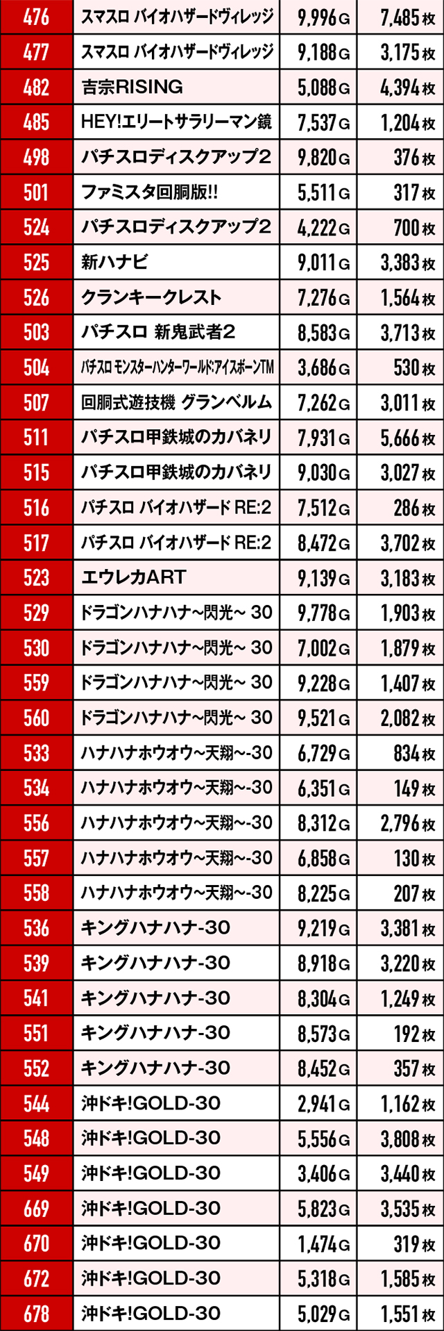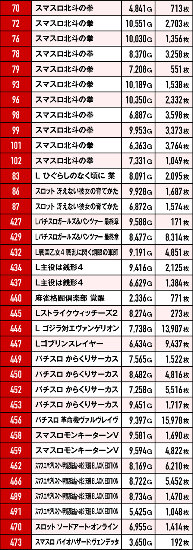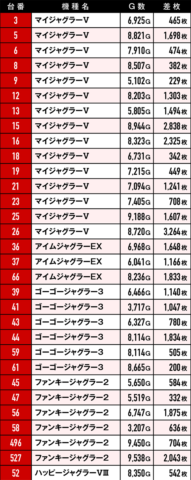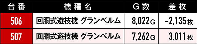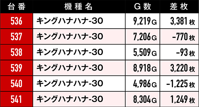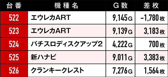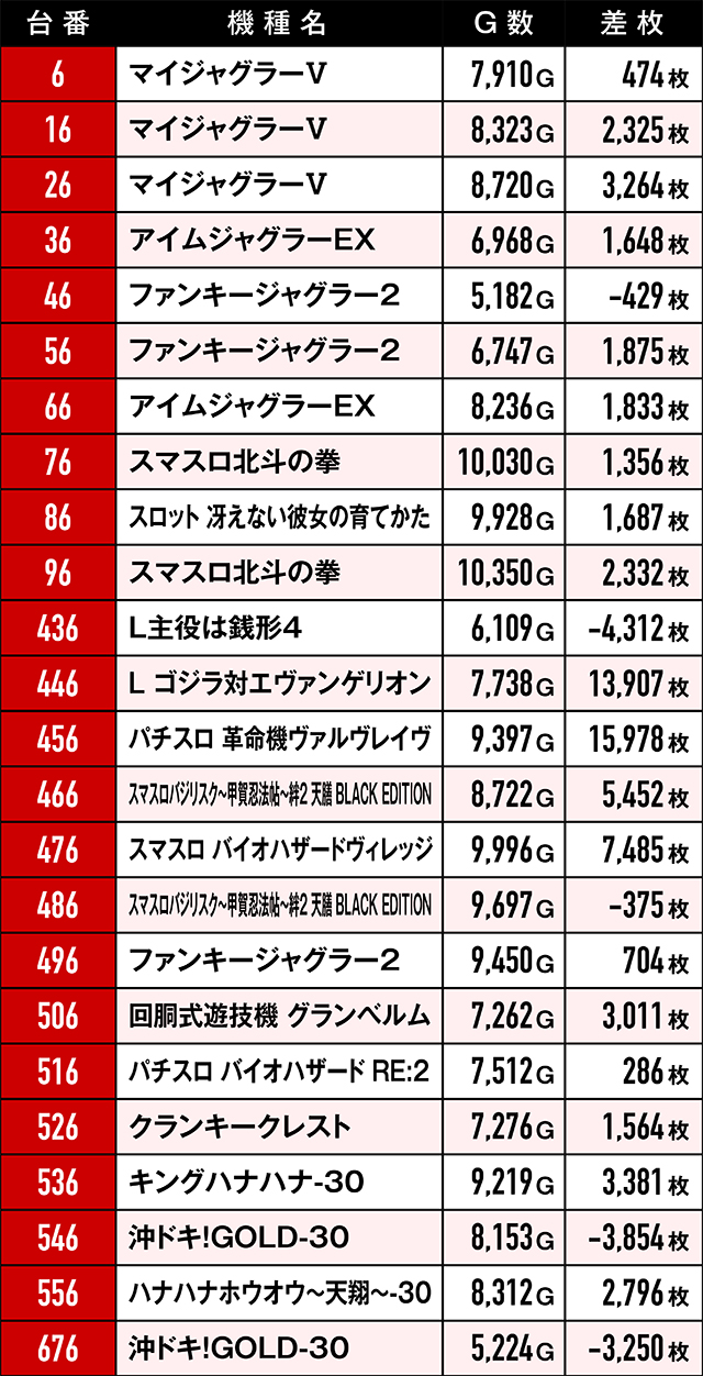 優秀台挙動を見せていたにも関わらず、ゲーム数不足や展開が悪くマイナスで終わってしまった台たち。ここで注目していただきたいのは台番。台番を見る限りでは並びと末尾6の仕掛けがあったと見るべき…?