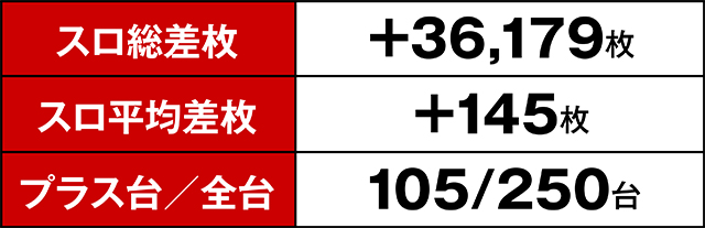 この日のプラス台は合計105台!パチスロ総台数が250台なので、約2.4台に1台がプラっていたことになる。さらにそれらプラス台の約1/3にあたる30台が+3,000枚超えを達成。さらにさらに13,000枚超えレコードが2台も誕生するという凄まじい結果となった。これならREDも当然…!?