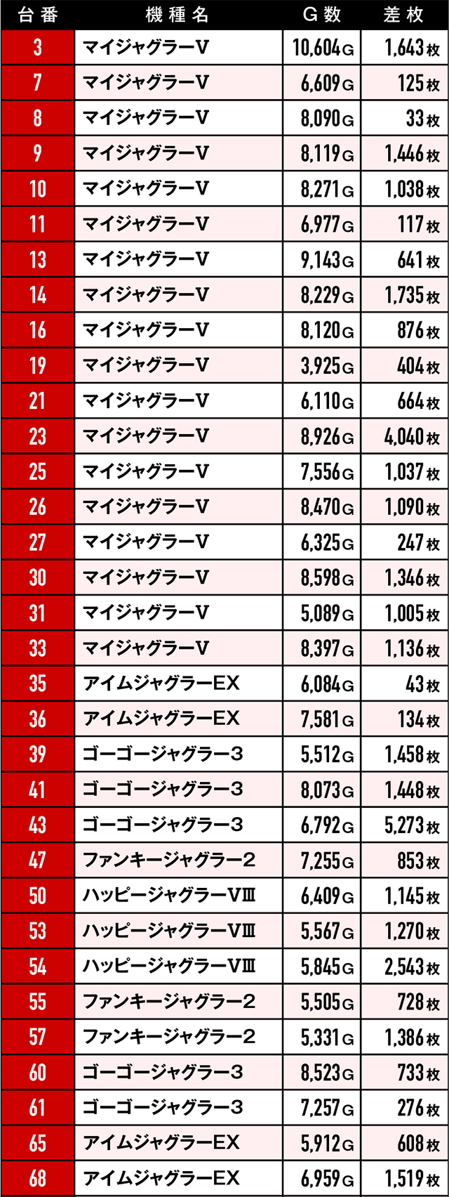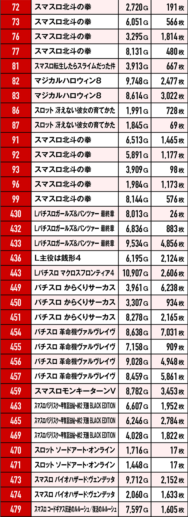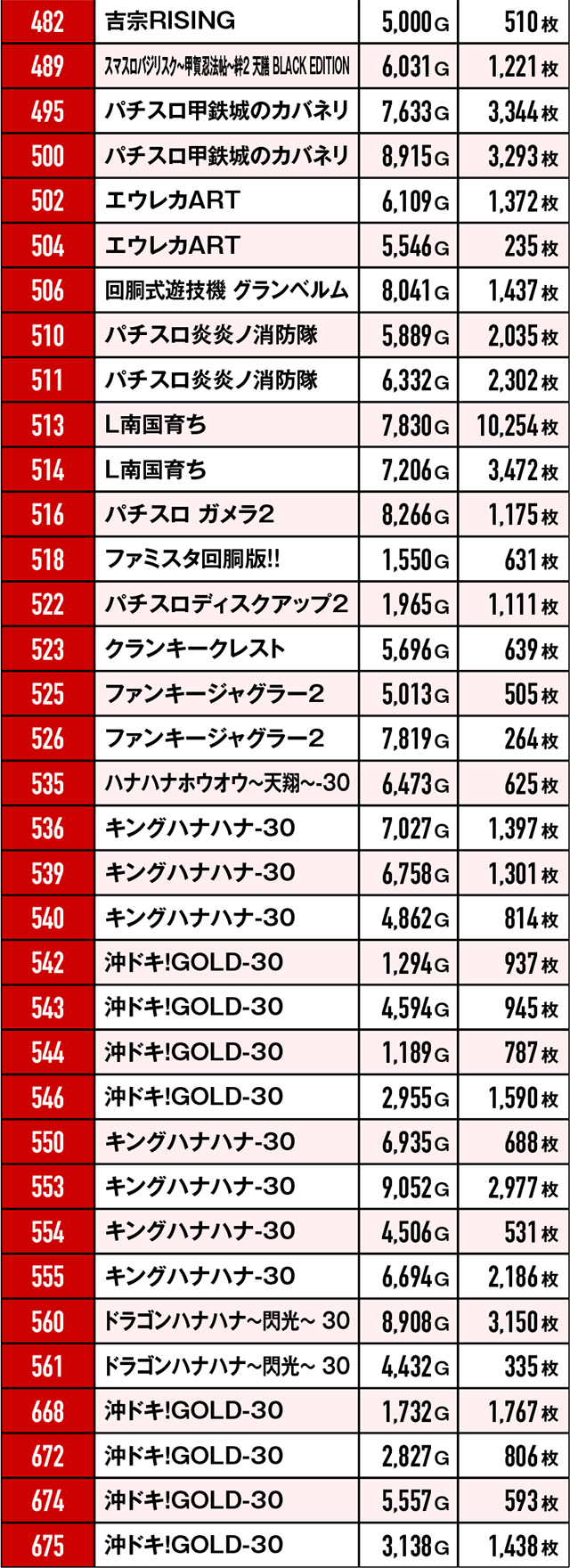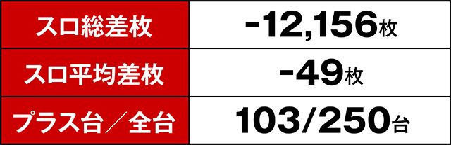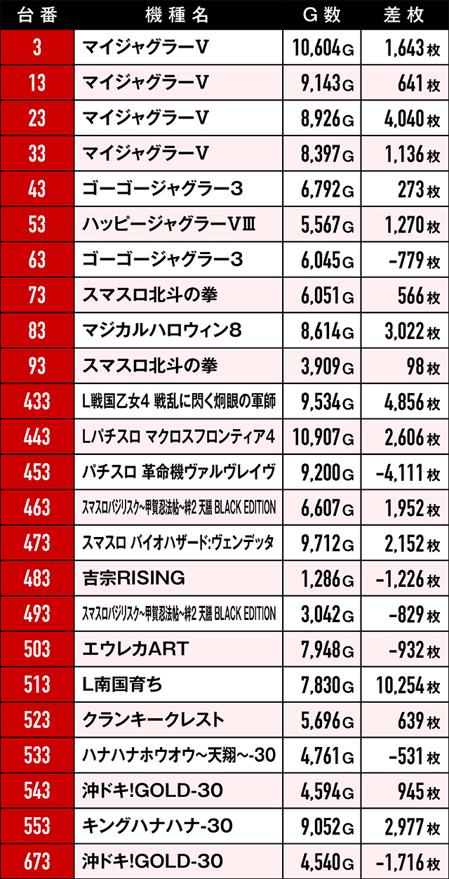 今回のプラス台は合計103台!パチスロ総台数が250台のため、トータル勝率は41.2%ということになる。それだけでも十分賞賛に値する結果だが、5,000枚オーバーが5台も生まれていたことにも驚きを隠せない。また少し前に導入されたばかりの『L南国育ち』からさっそく10,000枚超えが誕生したことにも唸らざるを得ない。