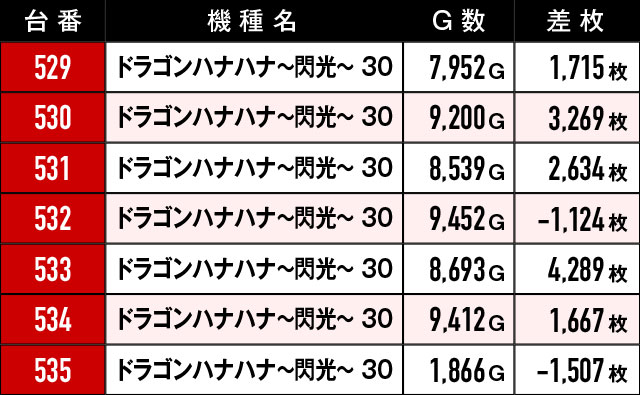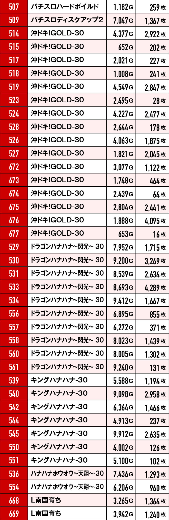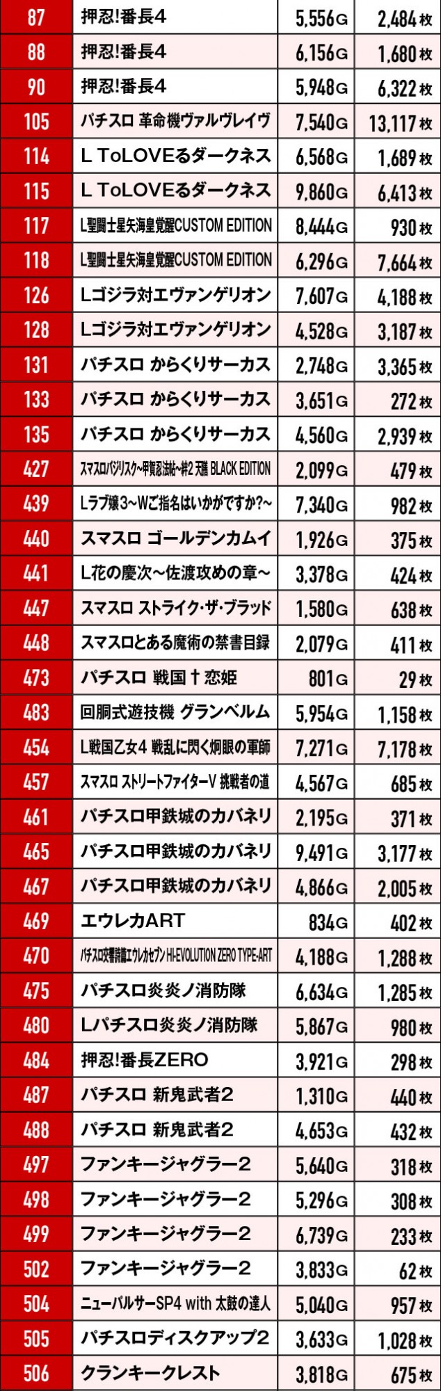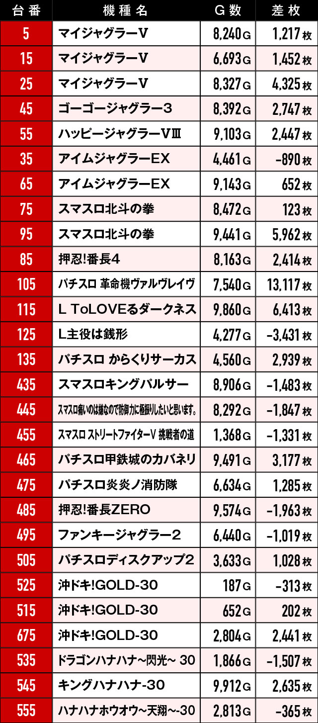 REDの日には優秀台が並びで配置される傾向が見られるが、この日もそのクセが強く出ていた模様。おかげで常連さんにとっては非常に立ち回りやすい環境だったのではないだろうか。また末尾⑤の台にも優秀台挙動を示している台が多く見られ、その中には首位記録の『パチスロ 革命機ヴァルヴレイヴ』105番台も含まれていた…!