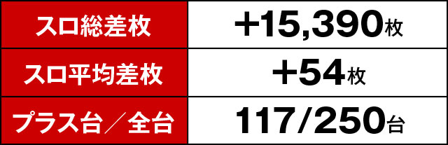 この日も数多くのプラス台が誕生。その台数、実に117台!前回よりも10台以上増加しており、スロ全台の平均差枚もまずまず。首位レコードは『パチスロ 革命機ヴァルヴレイヴ』の13,117枚(!)、様々な機種から+3,000枚を上回る結果が生まれていた。