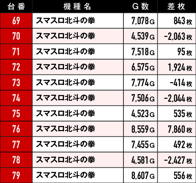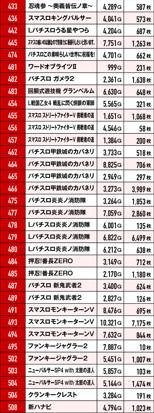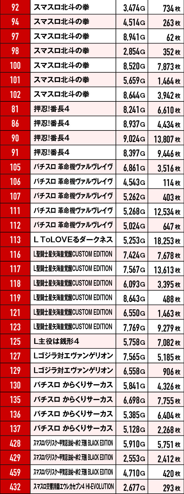 REDの日に参戦された方は周知の通り、今回もこれまでと同様に並びで優秀台の姿を多く見かけることとなった。『スマスロ北斗の拳』では設置の半数にあたる11台並び、『パチスロ 革命機ヴァルヴレイヴ』『L ToLOVEるダークネス』『L聖闘士星矢海皇覚醒CUSTOM EDITION』での3機種またぎによる11台並びなどを筆頭に、さまざまな並びがユーザーをお出迎え。また、今回は末尾④の台にも優秀台挙動が多く見られた。