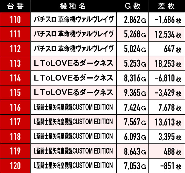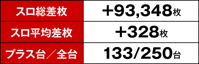 今回の20スロコーナーにおけるプラス台数は、過去最高の133台!20スロ総台数から逆算すると、約1.9台に1台がプラっていたことになる。1台あたりの平均も+328枚とかな~り優秀すぎる結果に。なおこの日は『押忍!番長4』『パチスロ 革命機ヴァルヴレイヴ』『L ToLOVEるダークネス』『L聖闘士星矢海皇覚醒CUSTOM EDITION』の4機種から+10,000枚オーバー記録が誕生っ!