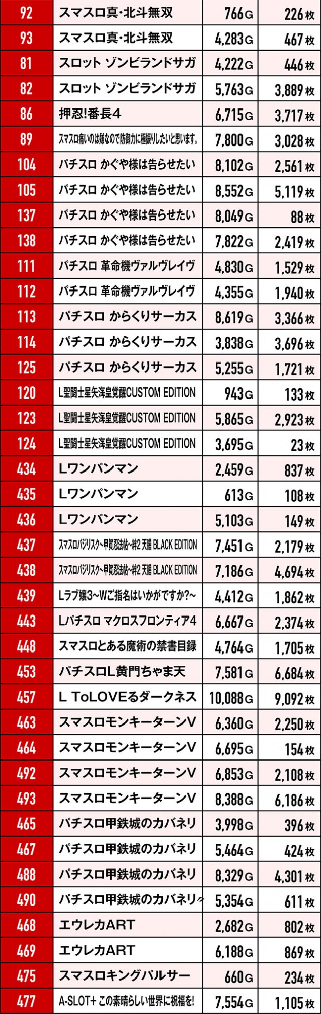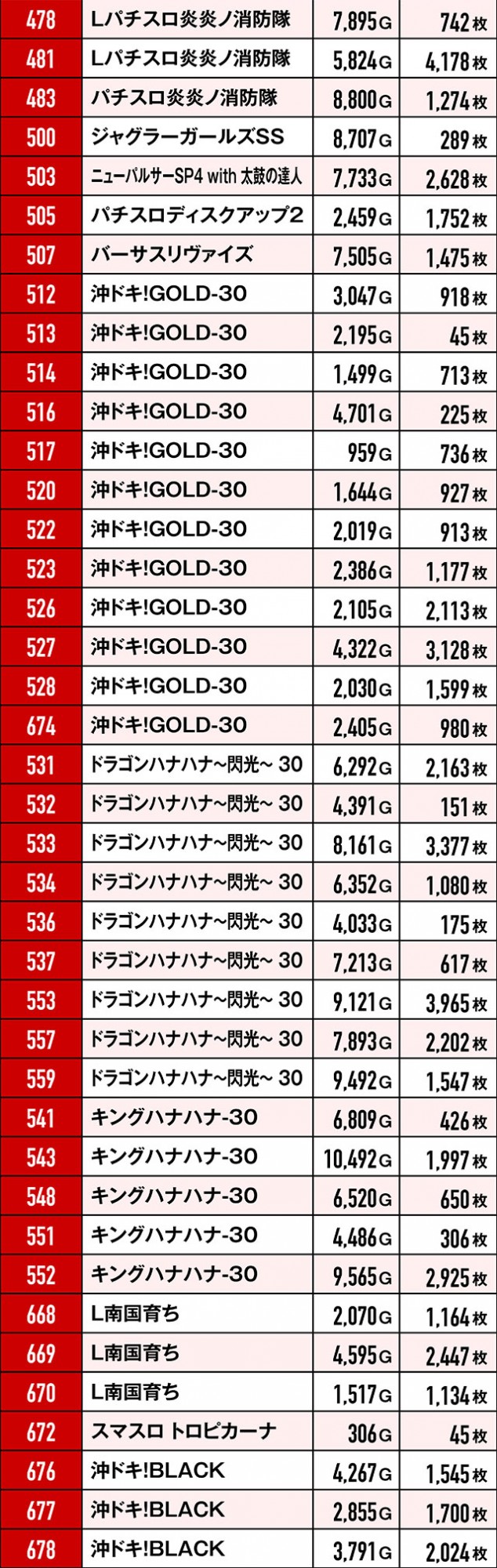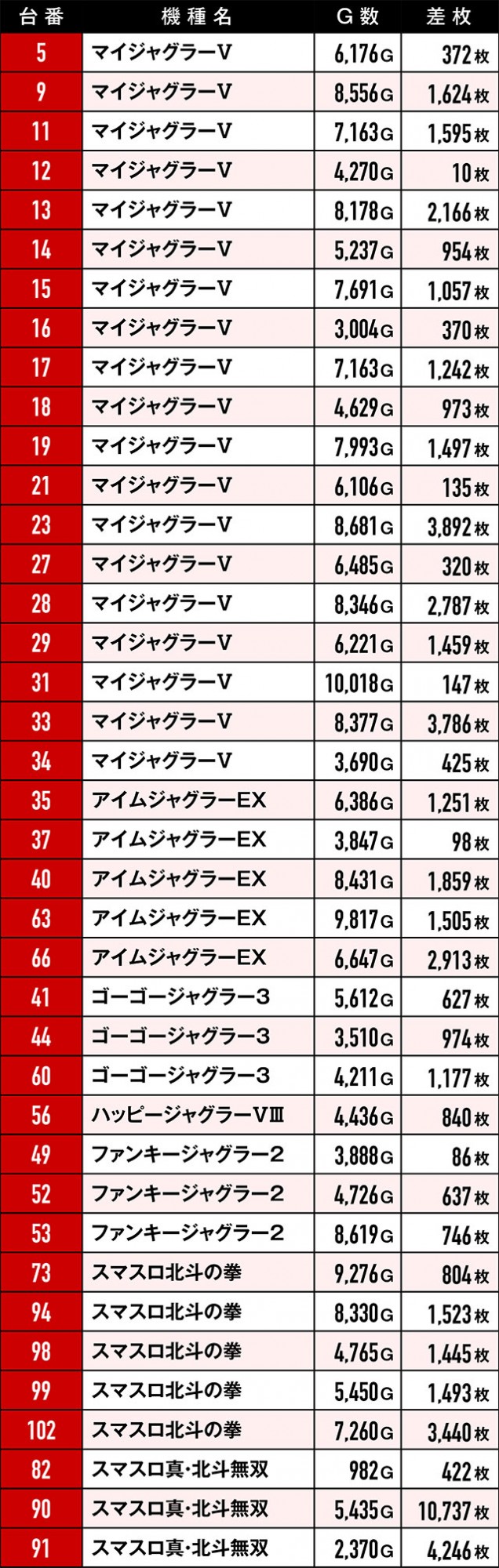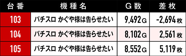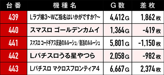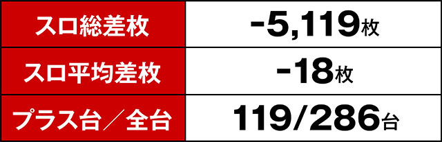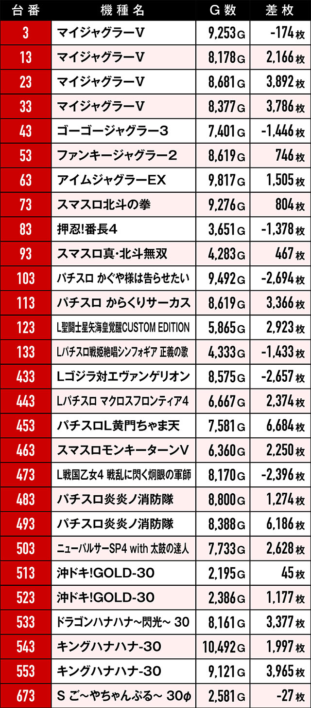 まず注目すべきは、末尾③の台のプラス率の高さ。これだけの台がプラっているばかりか、多くの台が2,000枚を超えているのはやはり偶然の一言で片付けるのは早計だろう。また、3台並び・5台並びで好挙動を見せていた箇所もあり!