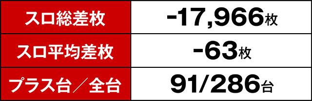 今回の20スロコーナーにおけるプラス総台数は91台!前回より23台も減ってしまった。それでもプラス率は39.8%をキープしており、約4割もの台がプラスだったことになる。そして今回も人気マシンからは複数のプラス結果が生まれていた上、『スマスロモンキーターンV』からはこの日の最高差枚となる13,153枚もの記録が誕生っ!
