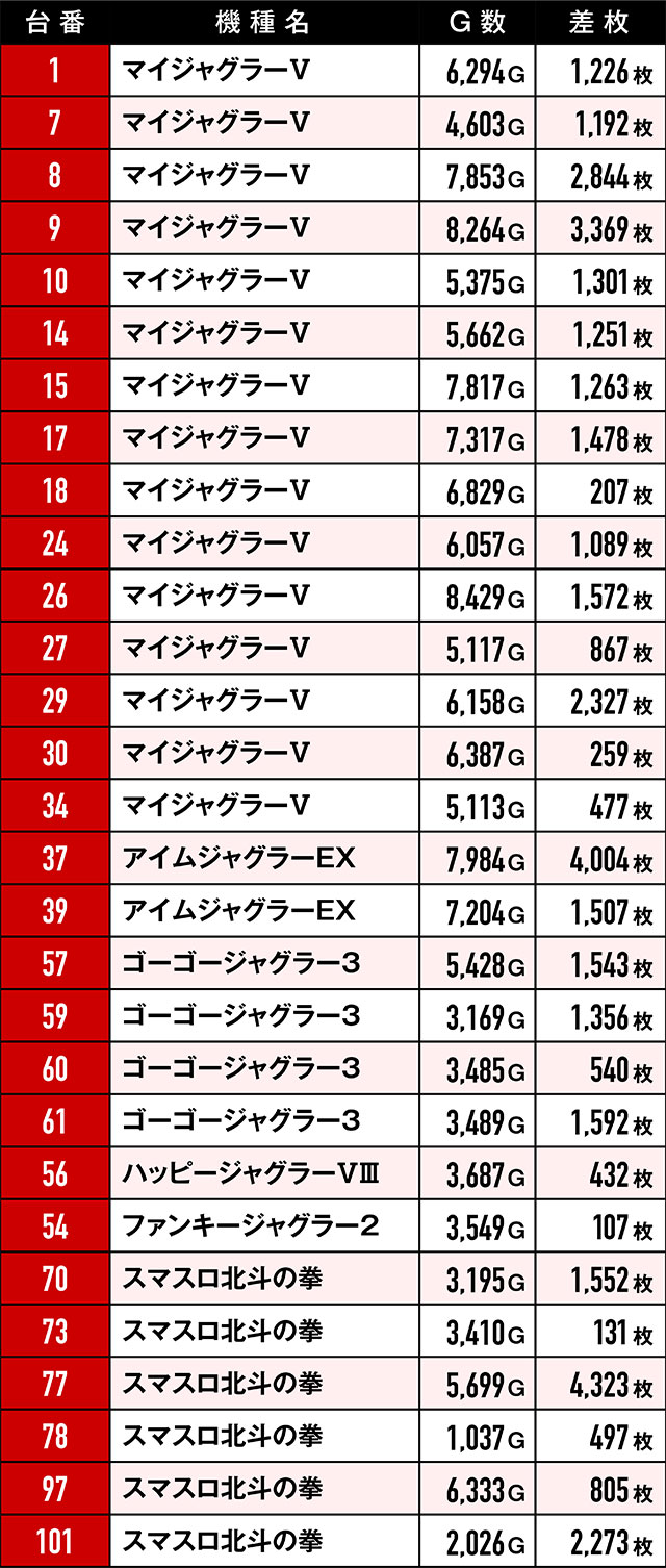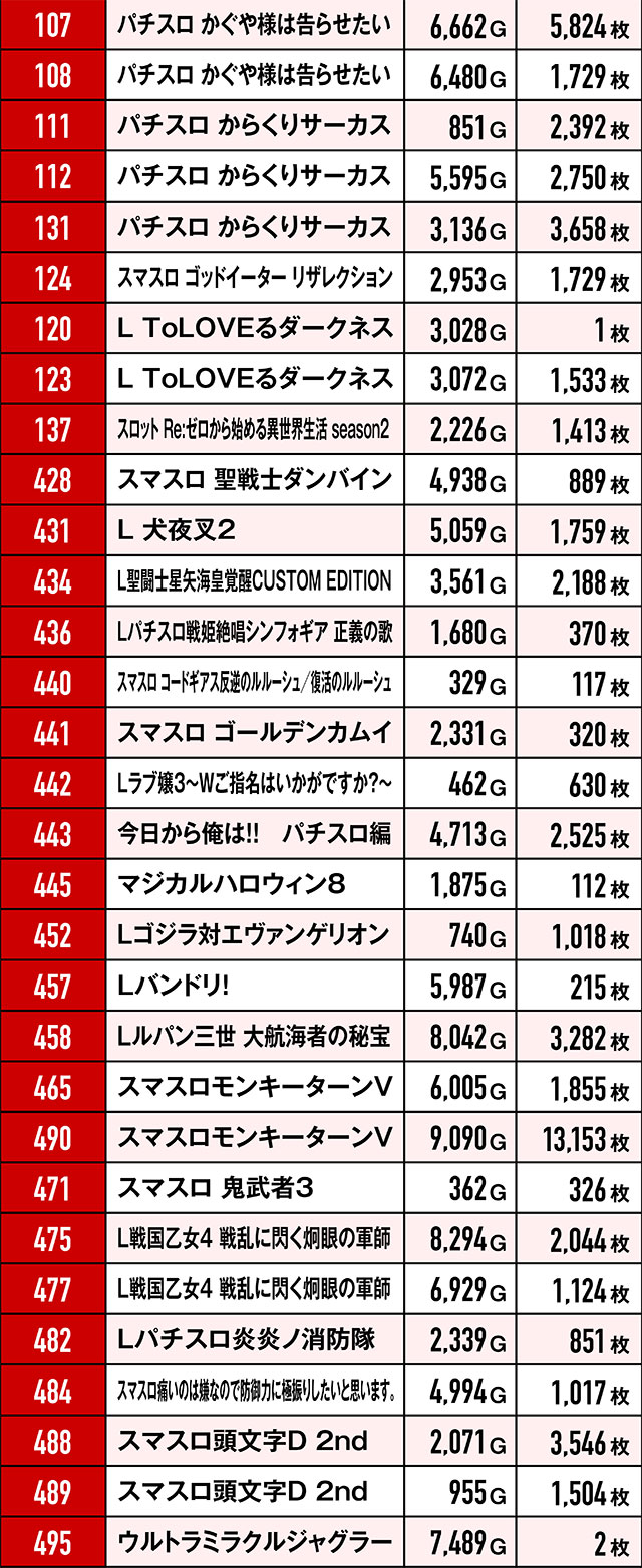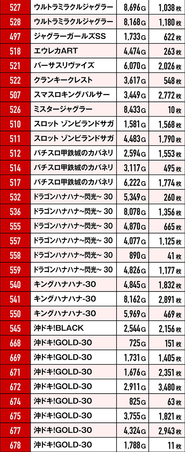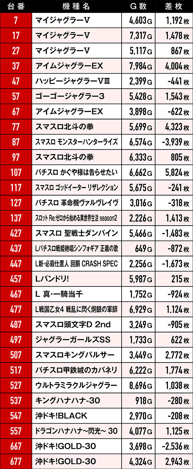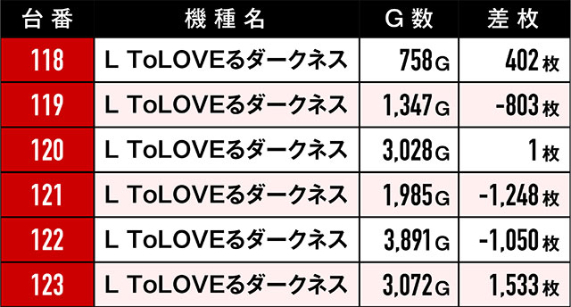 設置されているパチスロ全台がプラスになるなんてことは絶対にない。ゆえに今回も残念ながらREDになりきれなかった台が存在する。『L ToLOVEるダークネス』は全体的に総ゲーム数が少なく、思うような結果にならなかった印象。また、これまでと同様に優秀挙動を示していた台たちの台番を集計したところ、驚きの結果を目の当たりに…!