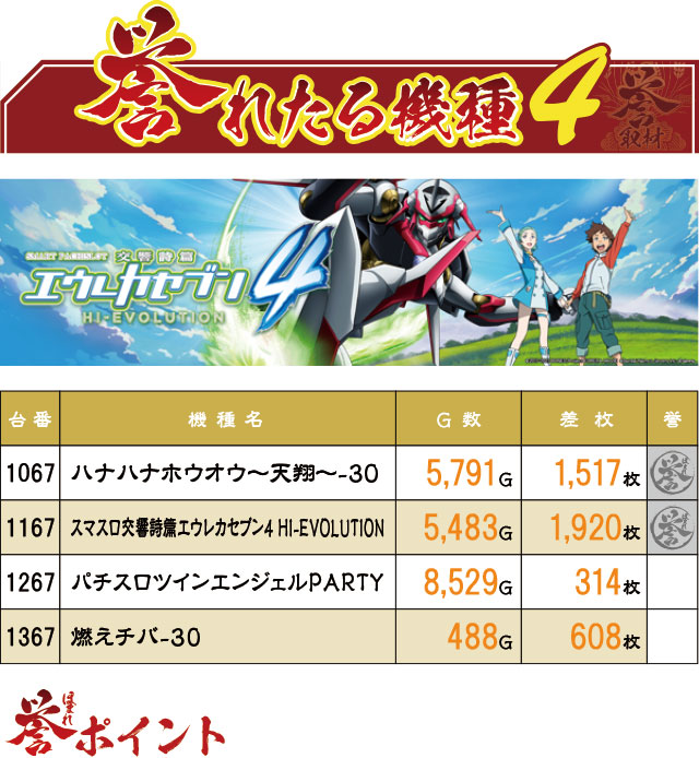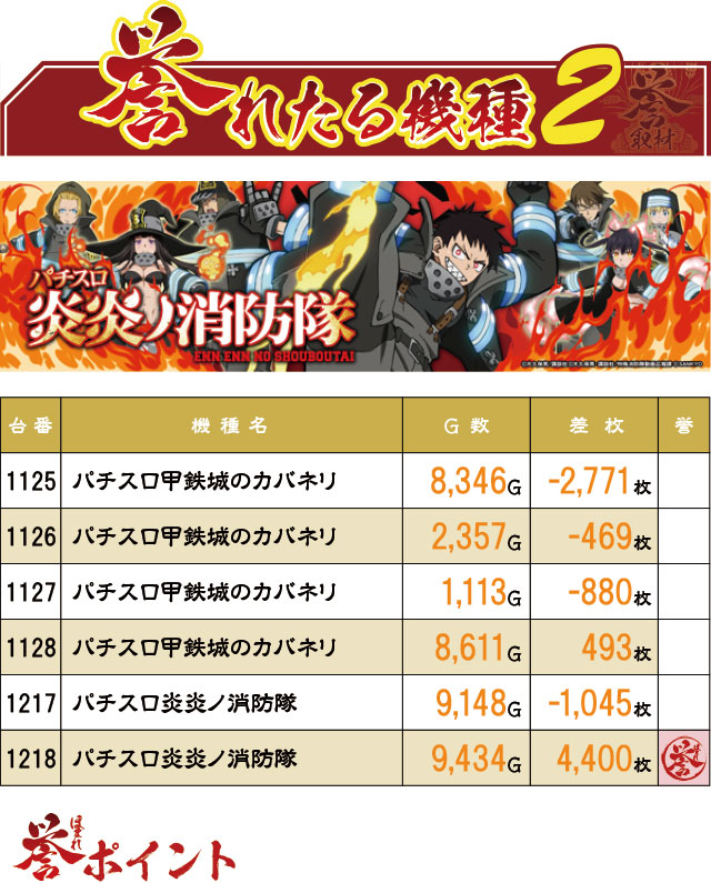 こちらは4台設置の『パチスロ甲鉄城のカバネリ』と、2台設置の『パチスロ炎炎ノ消防隊』の結果。1218番台が優秀台の意地を見せ、4,000枚突破を達成したものの、残りの台は思うような結果にはならず。