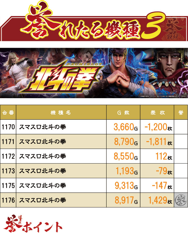 6台設置の『スマスロ北斗の拳』は運に見放されたのか、誉マークは1台のみ。とはいえ、マイナス台にはプラマイ0ラインのものもあり、かなりギリギリの戦いだったことがうかがえた。