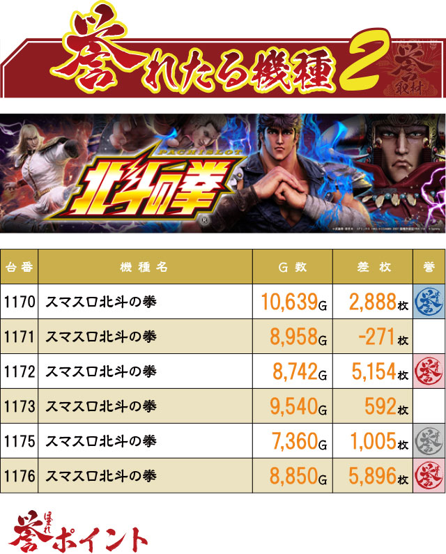 6台設置の『スマスロ北斗の拳』の勝率は83.3%(5/6台)。さらにその中の4台に誉マークが付いており、2台が+5,000枚オーバーの快挙!この結果から察するに、『北斗』は全台系だった…!?