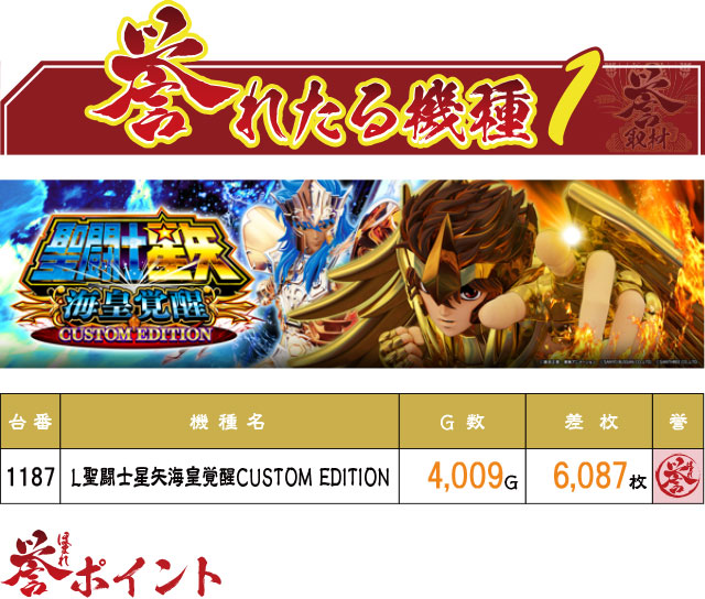 2台設置の『L聖闘士星矢海皇覚醒CUSTOM EDITION』は、1187番台が優秀台まっしぐらな挙動を披露し、+6,000枚超えを達成!見事な赤誉マークっぷりに打っていた方も確かな手応えを感じていたに違いない。