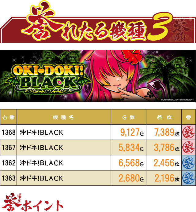 直近で仲間入りしたばかりの『沖ドキ!BLACK』は、6台中4台に誉マーク!さらにそのうちの2台が赤誉マーキング、1368番台は+7,000枚超えという文句ナシの結果だった。