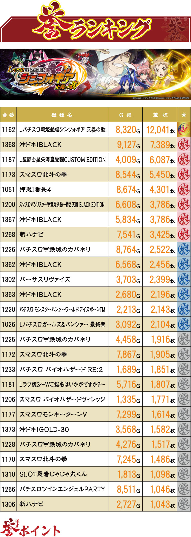導入されたばかりの新台『Lパチスロ戦姫絶唱シンフォギア 正義の歌』がさっそく本気を出し、+12,000枚超えでフィニッシュ!2位に大差をつけての独走レコードだった。また同じく導入間もない『沖ドキ!BLACK』は、TOP15位内に4台がランクインするなど目立つ活躍を見せてくれた。