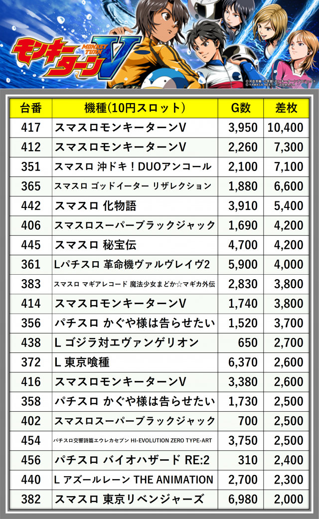 ※差枚数順に掲載しています