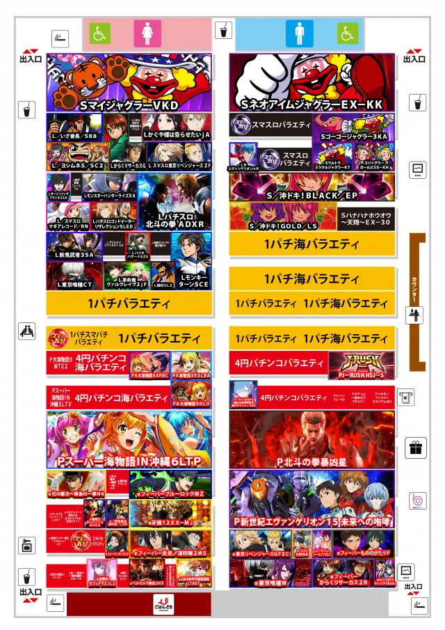 4パチ:320台 100円/89玉貸パチ:160台 1000円46枚貸スロ:240台 |