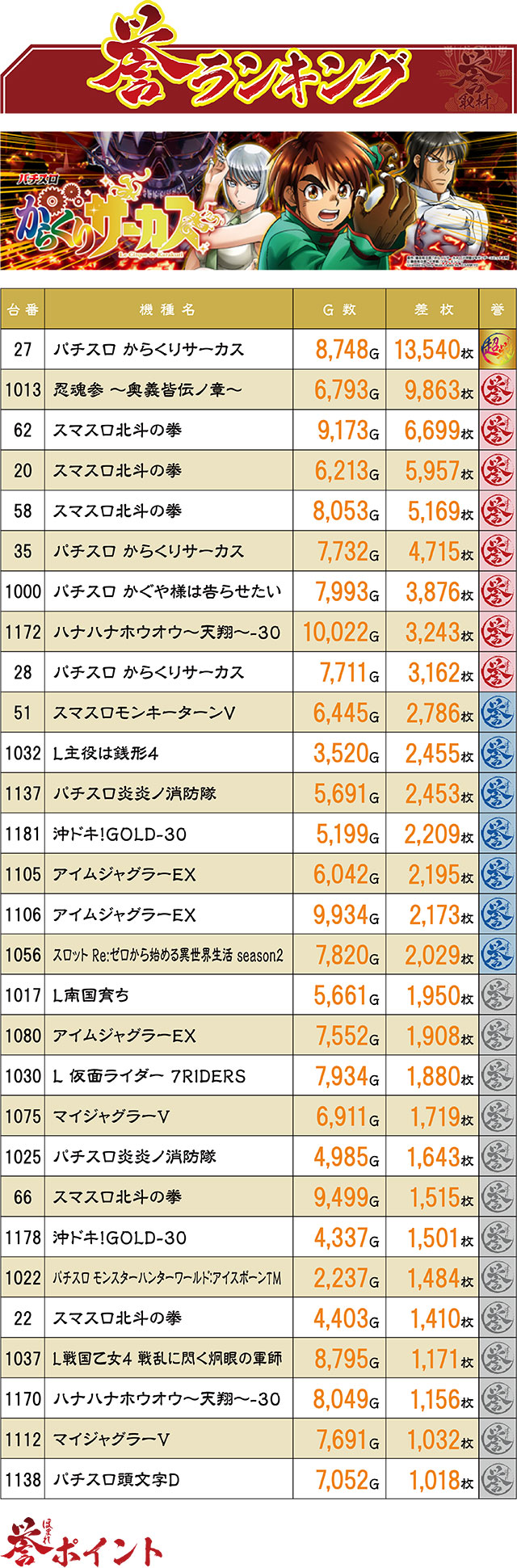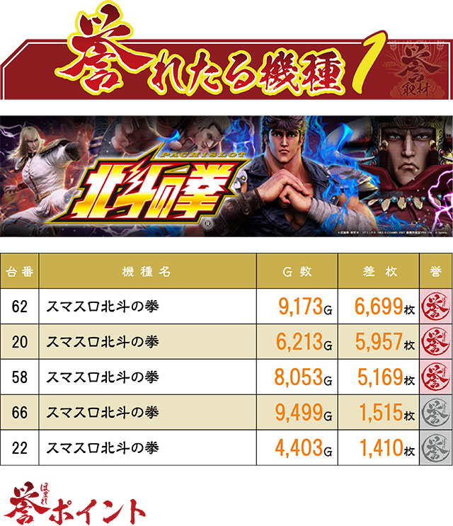 記念すべき初・誉取材の首位の座に君臨したのは、13,000枚オーバーを達成した『パチスロ からくりサーカス』。意外だったのは2位にランクインした『忍魂参 ~奥義皆伝ノ章~』で、バラエティー機種ながら9,800枚超えの見事な結果を披露してくれた。また、3~5位には『スマスロ北斗の拳』が連続ランクイン!