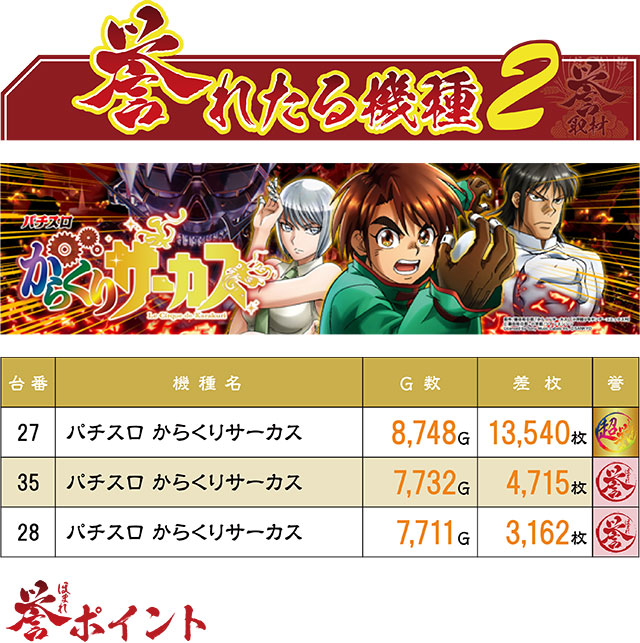 この日の首位レコードとなった27番台をはじめ、赤誉マークも2台誕生!『北斗』と同じく『パチスロ からくりサーカス』にも優秀台が多く潜んでいた可能性が濃厚だ。