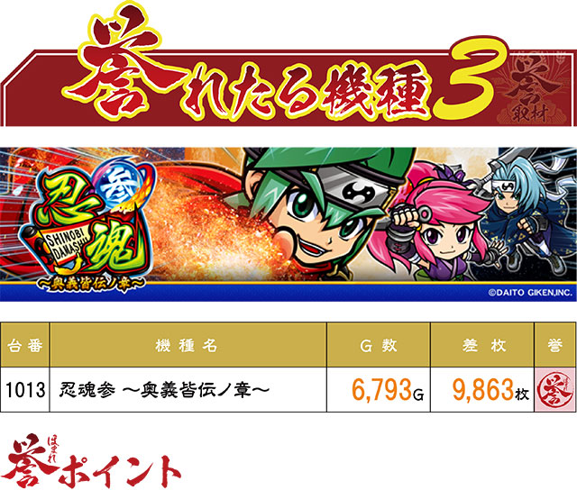 1台設置の『忍魂参 ~奥義皆伝ノ章~』が、まさか10,000枚に迫る特大記録をマークし、誉ランキング2位につけるなど、誰が予想しただろうか。いずれにしろ、バラエティーコーナーにもしっかりチャンスが潜んでいたのは嬉しい限り。