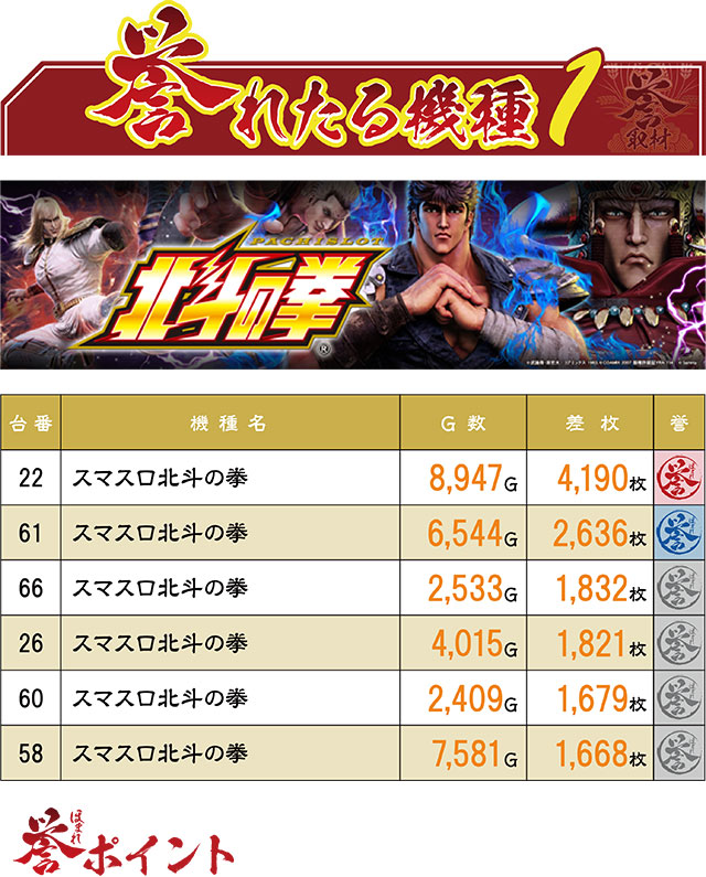 前回も好調で、5台の誉レコードを生み出した『スマスロ北斗の拳』だが、今回はそれを上回る6台の誉マークが出現。しかし赤誉マーク(=3,000枚以上)は22番台のみと、少々寂しい結果に…。