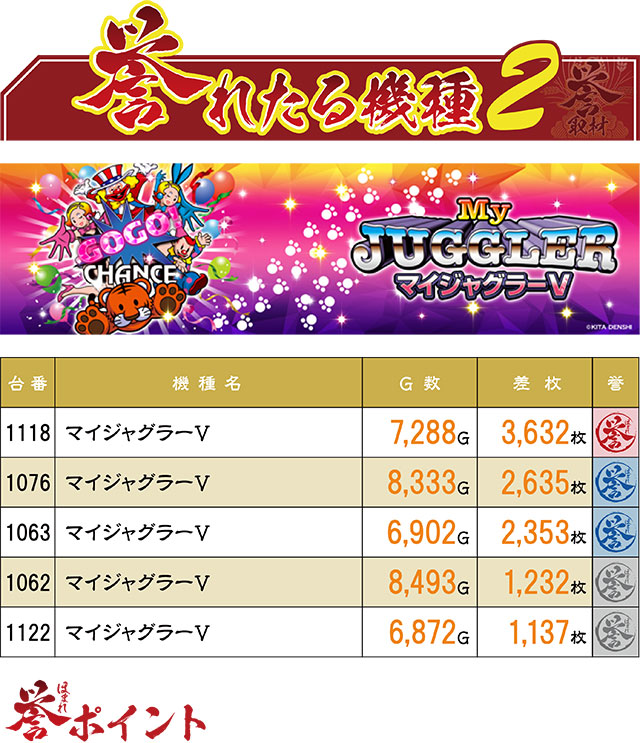 勝率約5割をキープした『マイジャグラーⅤ』からは、5台の誉マーキングが誕生。特に好調だったのが1118番台で、『ジャグラー』シリーズの中ではこの日唯一の3,000枚オーバーを達成することに成功した。