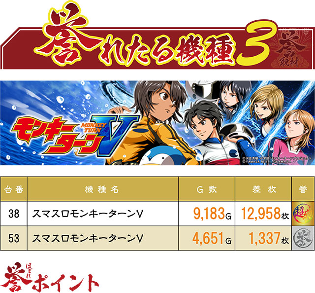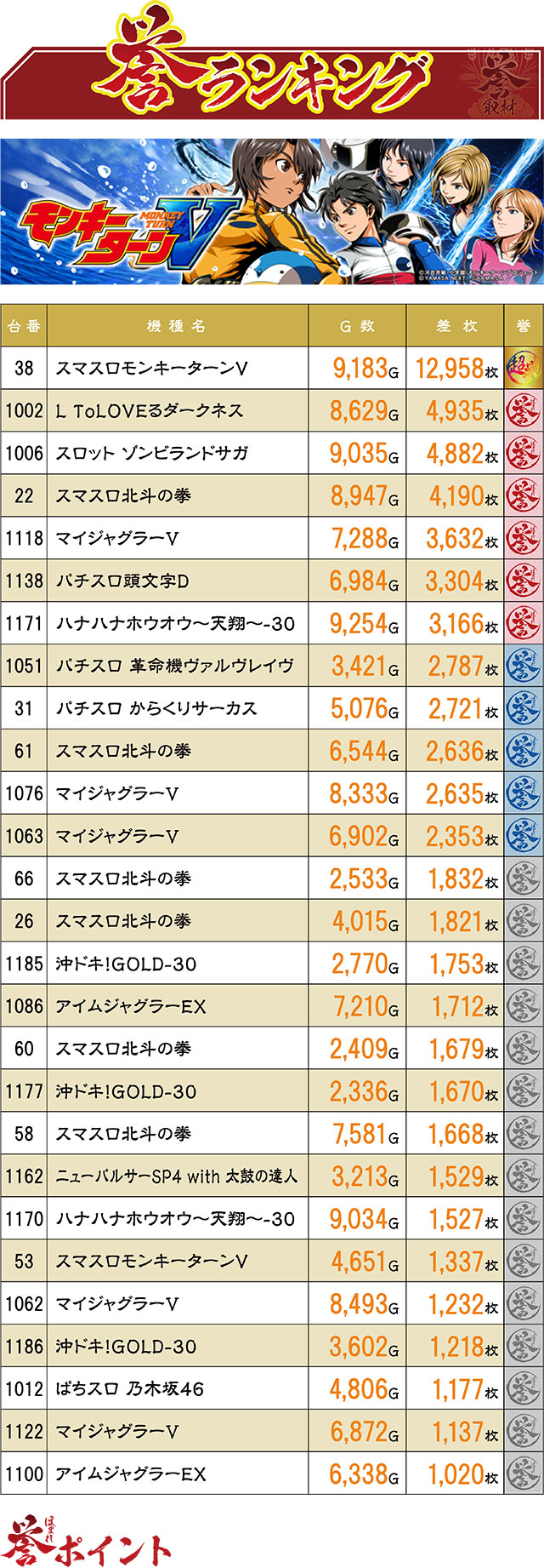 前回に続き、今回も12,000枚オーバー台が誕生!見事な結果を残したのは『スマスロモンキーターンV』の38番台だった。だがしかし、2位の記録は5,000枚を下回るものであり、前回と比較するとパワーダウンの否めないランキングとなってしまった。