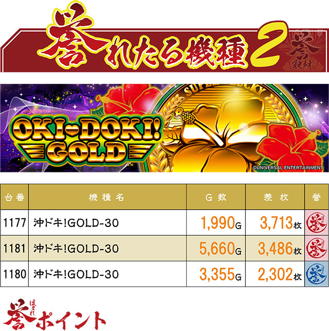 2台の赤誉マーキング(=3,000枚以上)を生み出した『沖ドキ!GOLD-30』。TOP30ランキングに3台が入賞するなど、なかなかの活躍っぷりを披露してくれた。この勢いから察するに、次回はさらなる活躍を見せてくれるはず!