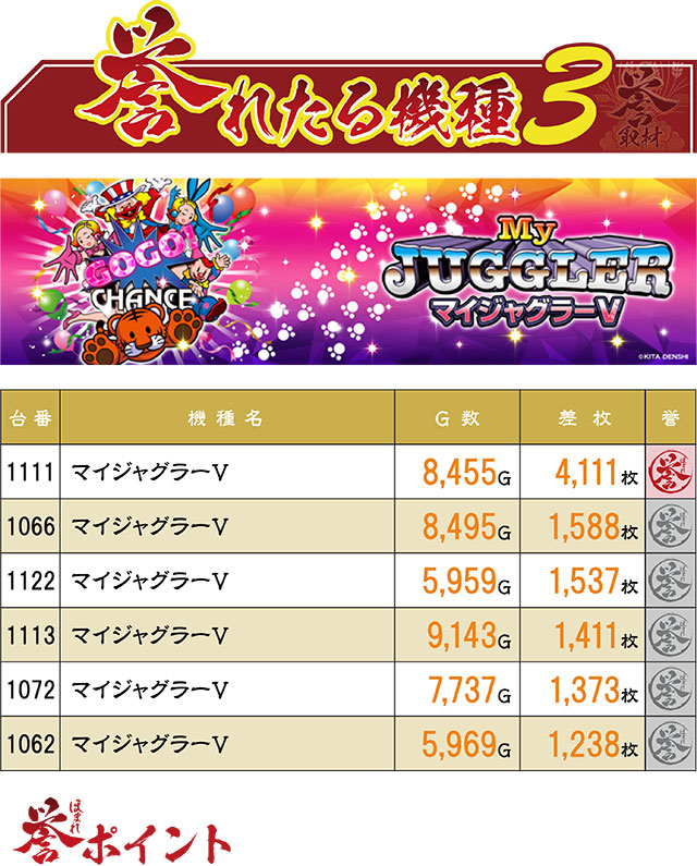 今回も『マイジャグラーⅤ』から複数の誉マークが誕生!特にめざましい活躍を見せたのは、唯一の赤誉マークにして4,000枚超えを達成した1111番台。やはりこの店の『マイジャグラーⅤ』は強かった!