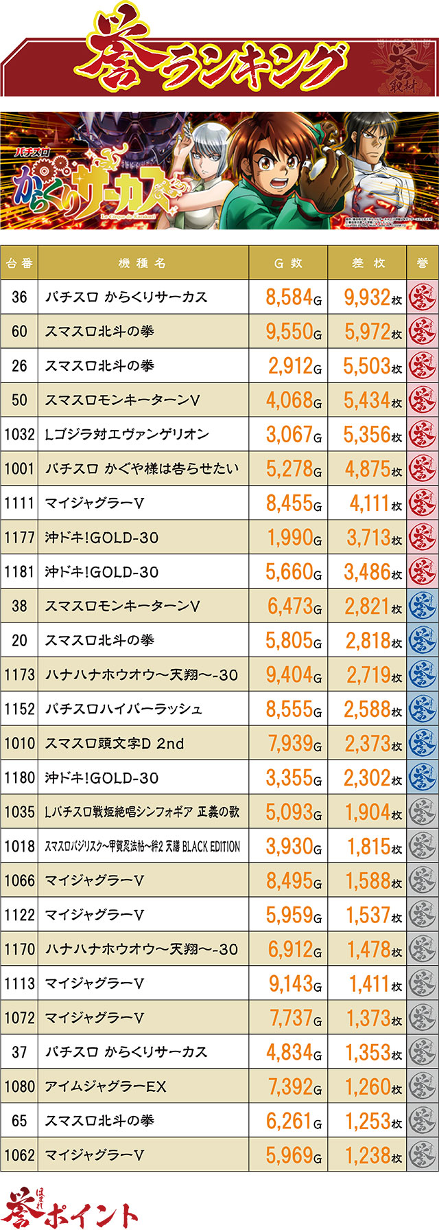 今回、最高差枚スコアを叩き出したのは『パチスロ からくりサーカス』。惜しくも10,000枚には届かなかったものの、優秀台挙動まる出しだったようだ。また、2・3位には『スマスロ北斗の拳』が連続ランクインしており、前回に続きまたしても強さを見せてくれた!