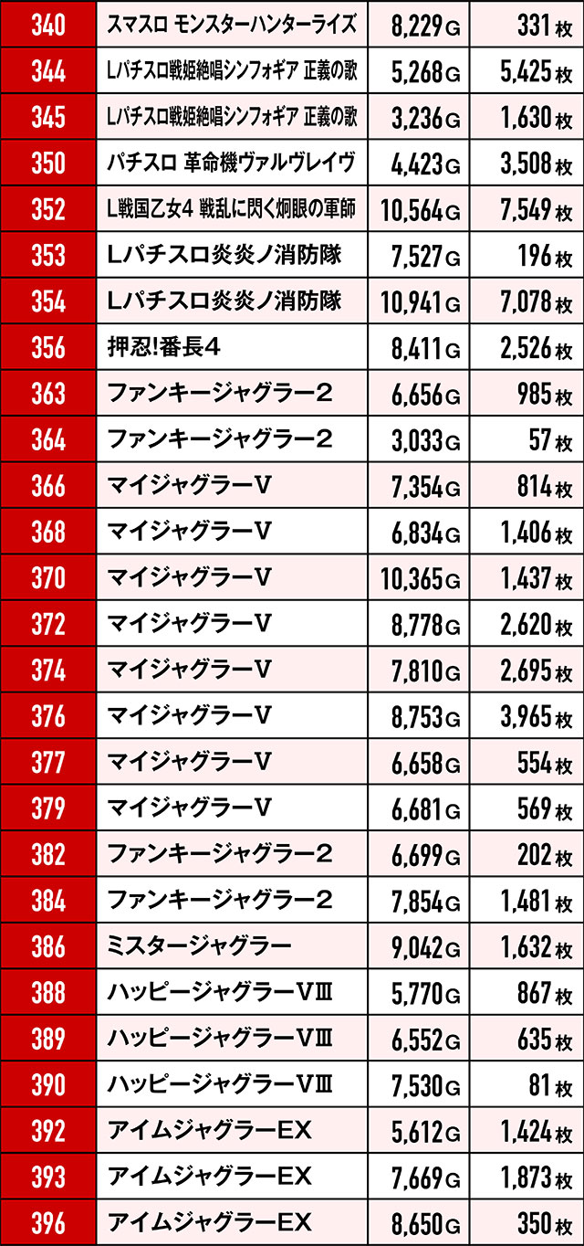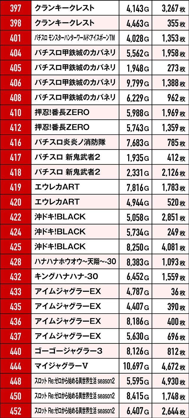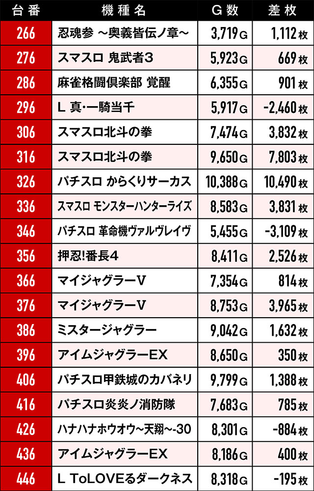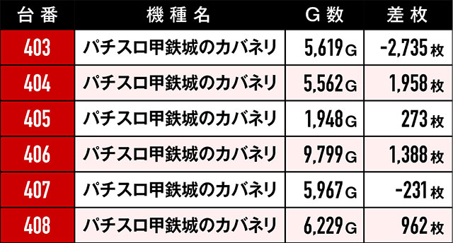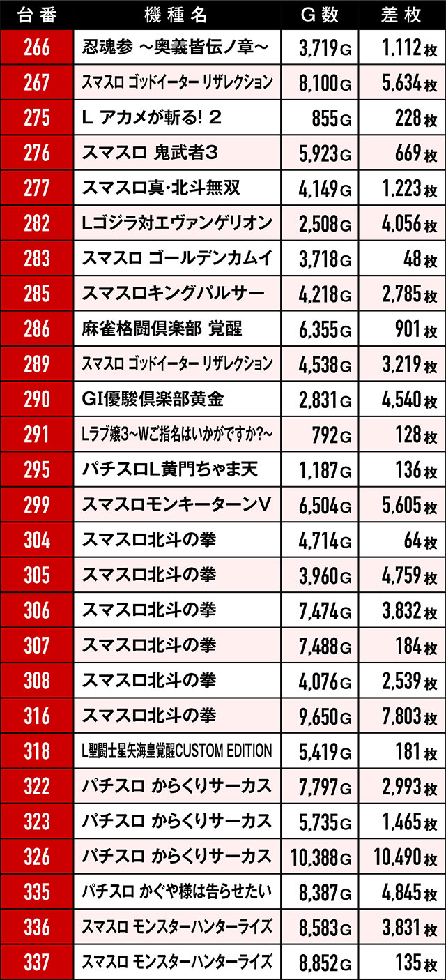 もちろん今回も、環境は良好だったのにREDに染まらなかった反逆台があった。ともに6台設置の『パチスロ からくりサーカス』と『パチスロ甲鉄城のカバネリ』はその最たる例で全台プラスとはならず…。また、前回と同じく優秀挙動を見せた台たちの台番を集計したところ、驚きの結果が…!