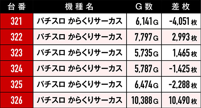 この日の総プラス台数は82台。4割以上の台がプラっていたため、実に様々な機種からプラス差枚が続出することとなった。その中で堂々の最高差枚レコードの栄誉に輝いたのは、10,000枚超えを達成した『パチスロ からくりサーカス』326番台。さらに常連さん人気の高い機種から5,000枚オーバー台が複数誕生!