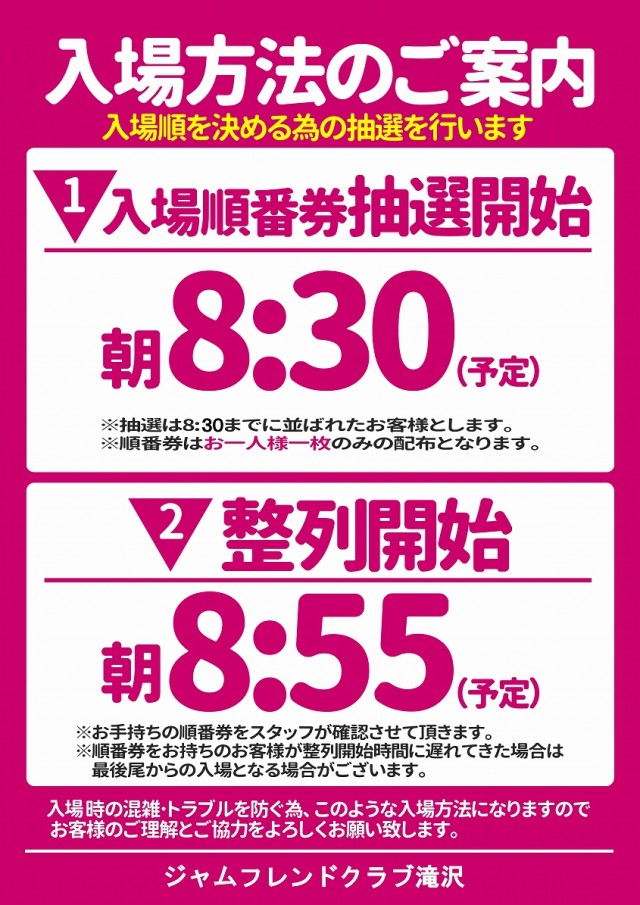 ⑪月②日朝9時オープン!店頭にて並び順入場♪