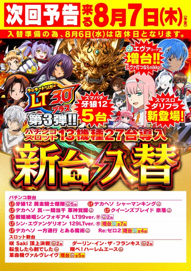 本日8月4日 1パチ増設&64機種113台新台入替!!