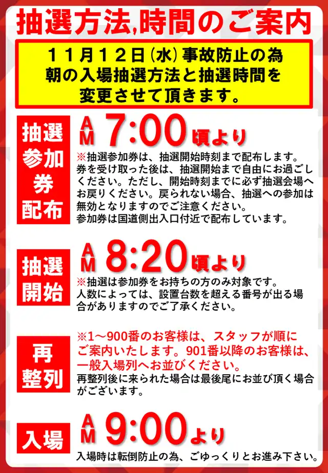 本日11月7日(金)朝9時開店!入場抽選は8時40分から!
