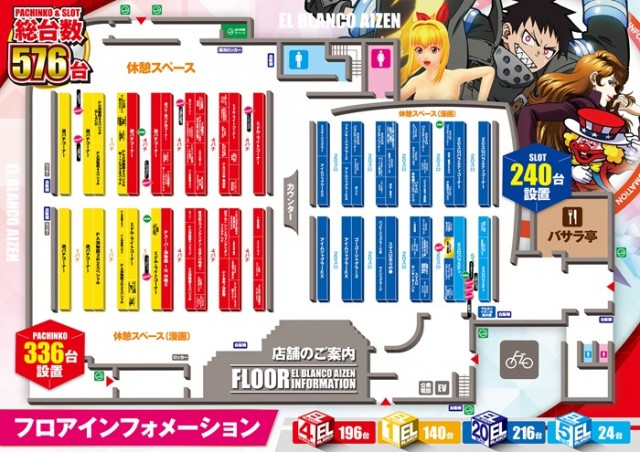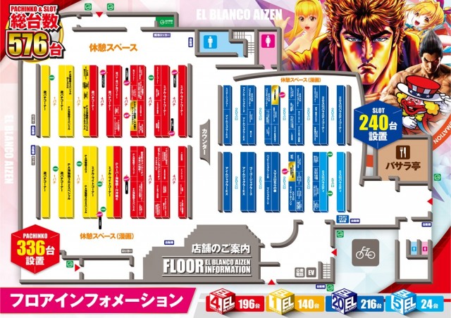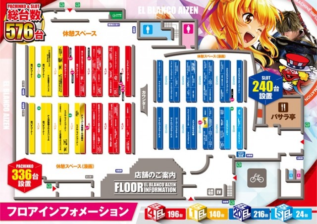 パチンコ[4]500円/125玉 :196台[1]200円/178玉:140台 計336台 |