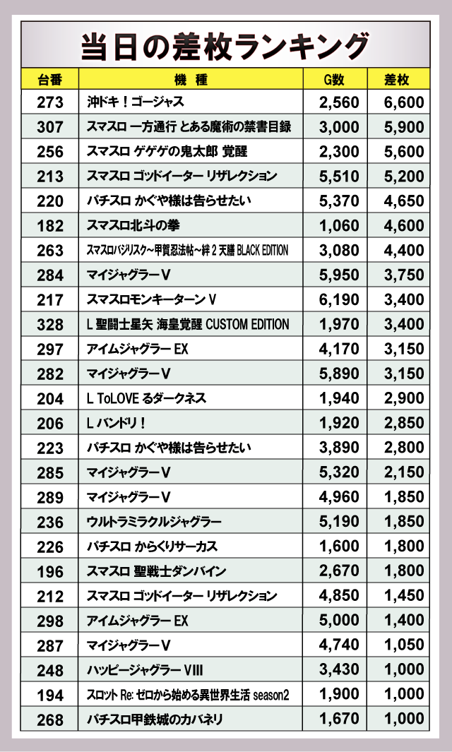 『沖ドキ!ゴージャス』から+6,000枚OVERが飛びだしており、店内の盛り上がりをリードする存在となっていた。またスマスロ機の活躍が目立っていたが、メダル機もしっかりランクインしており、幅広い機種にチャンスがあったことが窺える。