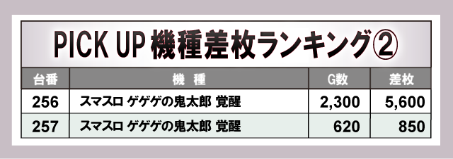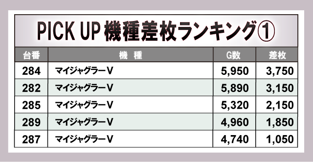 上表の5機種はいずれも大きなマイナスが見られず、ポテンシャルを秘めていた様子が窺える。『スマスロ ゲゲゲの鬼太郎 覚醒』『Lバンドリ!』は、全台プラス差枚数をマークし優秀機種として活躍を披露。『スマスロ ゴッドイーター リザレクション』も同様に気を吐いていた。そして『マイジャグラーⅤ』『アイムジャグラーEX』はコンスタントにGOGOランプが光り輝き、ファンは恍惚の表情を浮かべていたのが鮮烈だった。