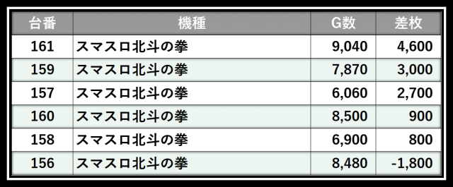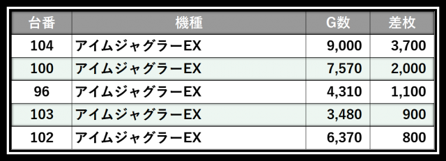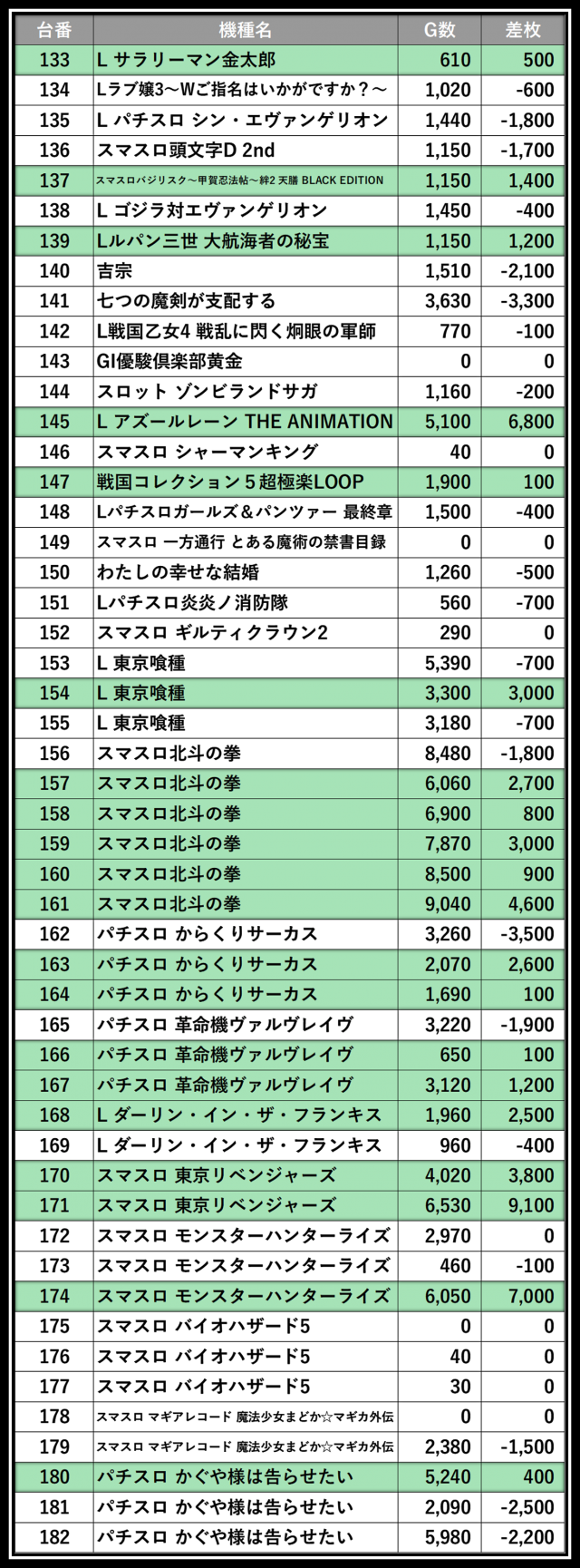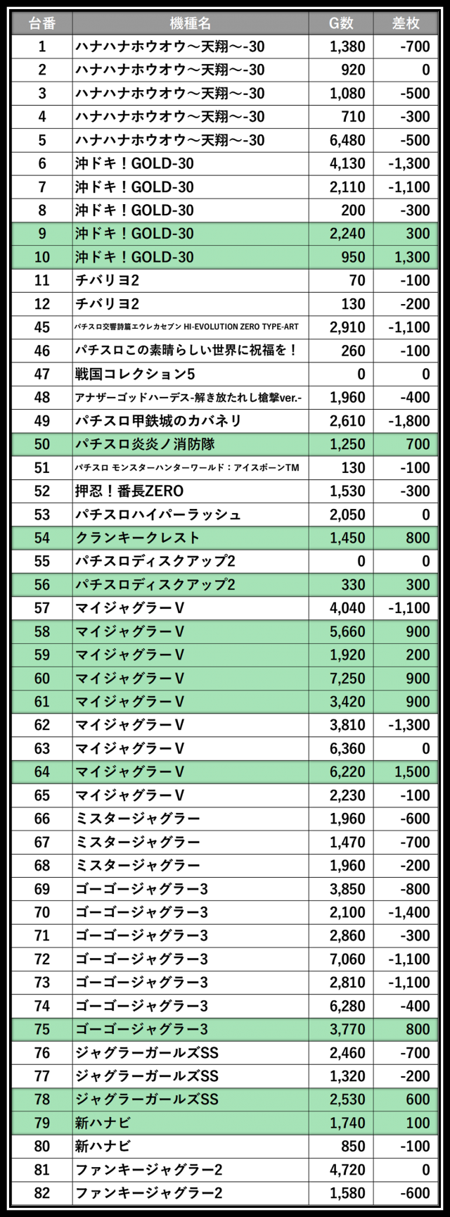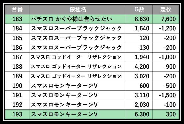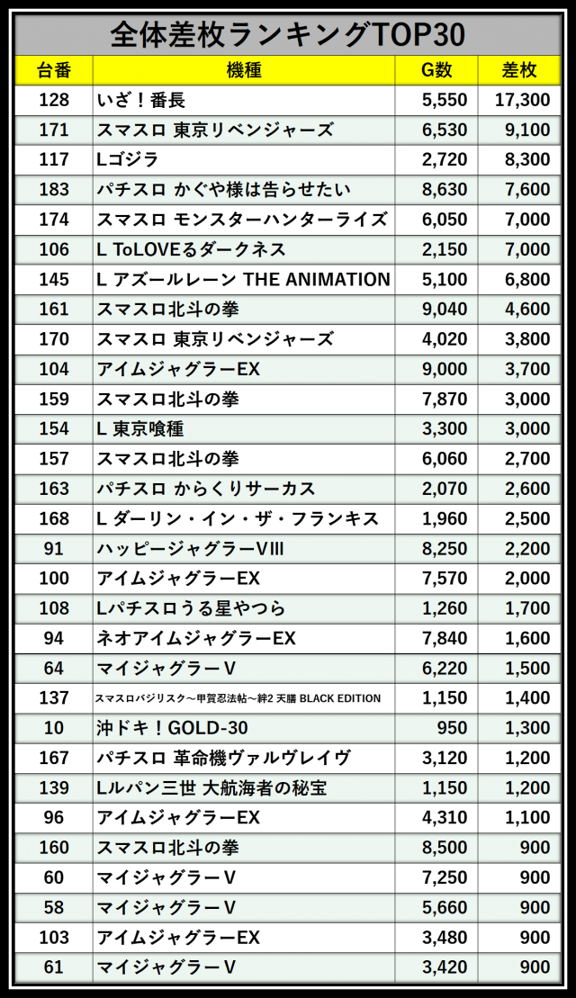 ※差枚数順に掲載しています
