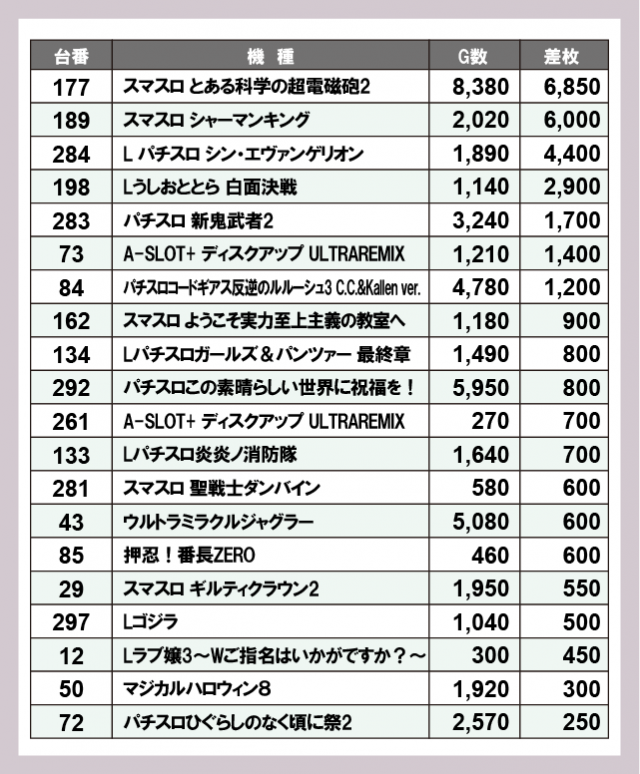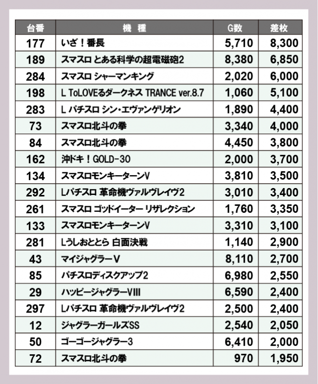 ※差枚数順に掲載しています