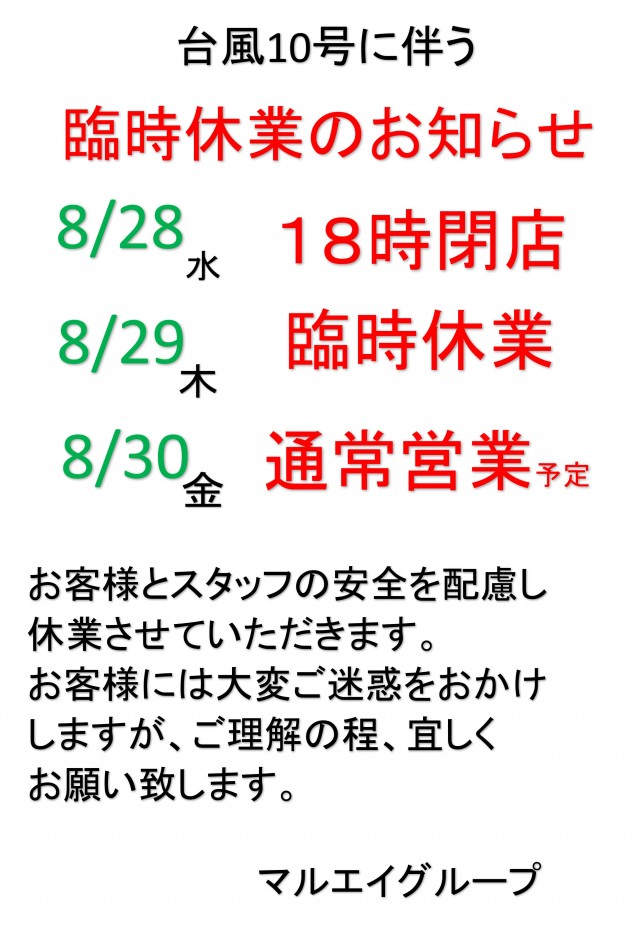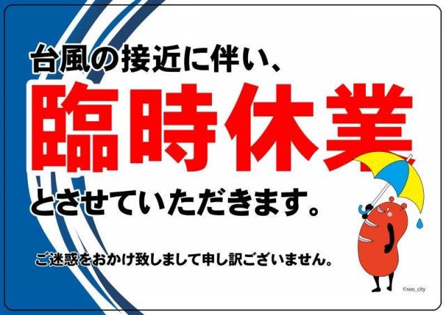 田上店は台風接近の為、本日臨時休業とさせていただきます。