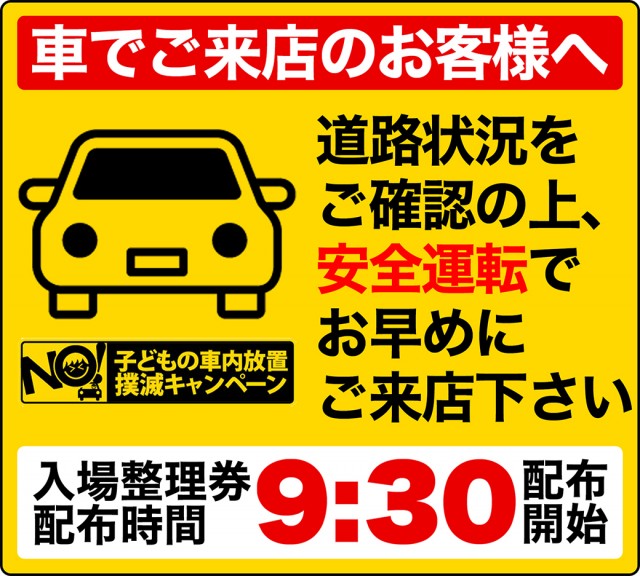 AM9:30までにお集まりのお客様を対象に、入場整理券の配布を行います。※朝の入場は先着順(並んだ順)ではありません。 |
