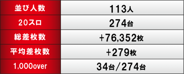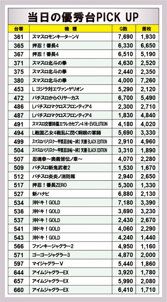 優秀台に目を通してみると、『スマスロ北斗の拳』380番台+7,260枚を筆頭に、『押忍!番長4』365番台+6,650枚や『パチスロからくりサーカス』472番台+5,490枚など、スマスロ人気機種から大きな熱が放たれていた。そのほか、『ジャグラー』シリーズでも同様に4桁プラス台が続出しており、同シリーズのポテンシャルが存分に発揮されていた様子が見受けられる。